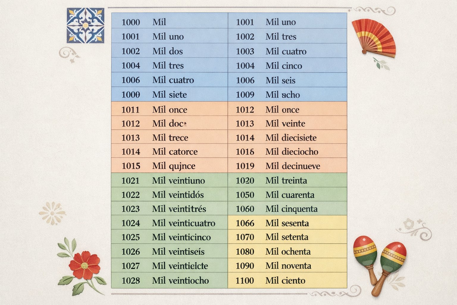 - Spanish numbers 1000–1100 use a base pattern: "mil" (1000) + any number from 1–100